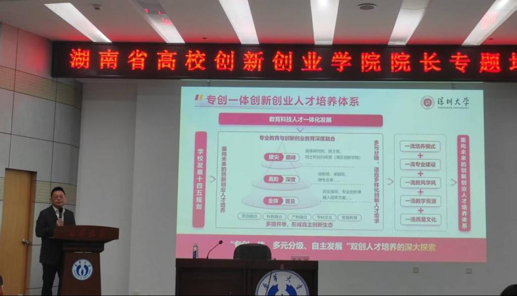 为深入贯彻落实习近平总书记关于创新创业工作的重要指示精神,积极响应省委、省政府关于支持大学生创业“七个一”行动的决策部署,进一步提升高校创新创业教育水平,推动专创融合与产教协同育人机制创新,湖南省教育厅于2025年10月30日至31日在南华大学红湘校区举办“湖南省高校创新创业学院院长专题培训班”。我校教务处及创新创业学院相关负责人应邀参训,全程参与学习研讨。